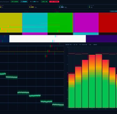 Stream Monitor Real-time Waveform (custom-painted IRE graticule) + Vectorscope (IQ plot w/ targets + flesh tone) + 16ch Audio Meters