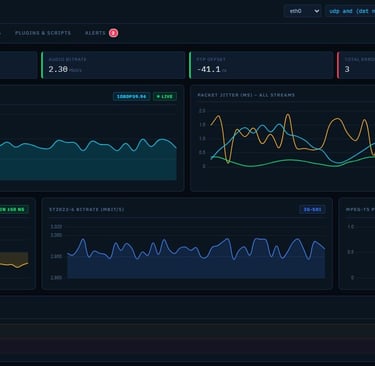 Dashboard Live overview — stream status cards, PTP badge, bandwidth, VRX/CMAX