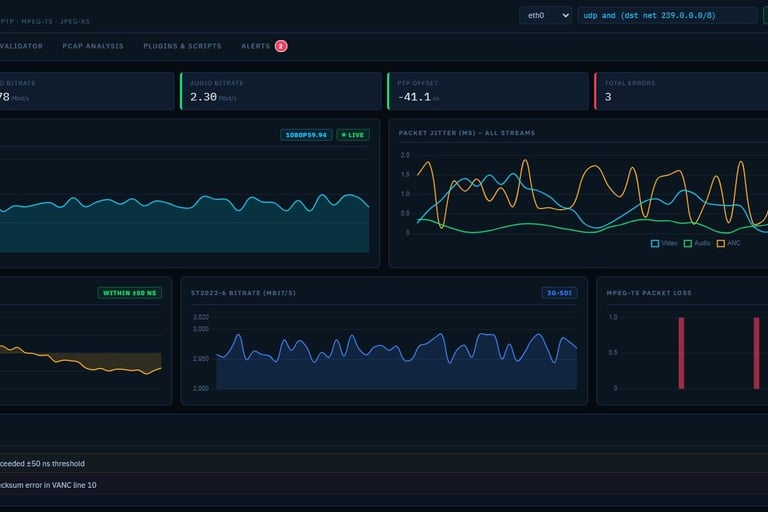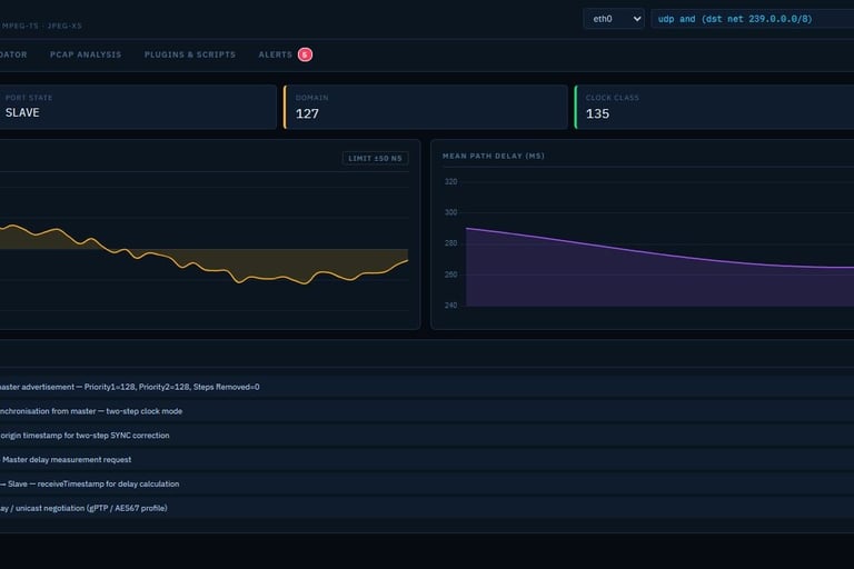 SDP Analysis Parse & validate SDP — checks 2110-20/30/40 parameters, PTP ref, network config