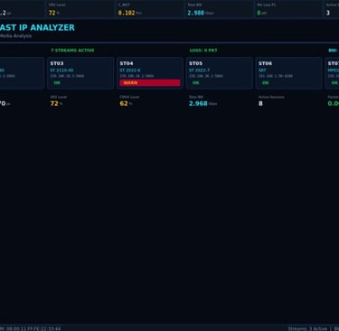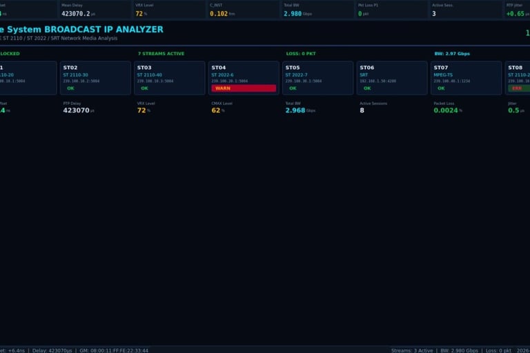 IP Status RTP session health, bandwidth + loss trend, per-stream session table